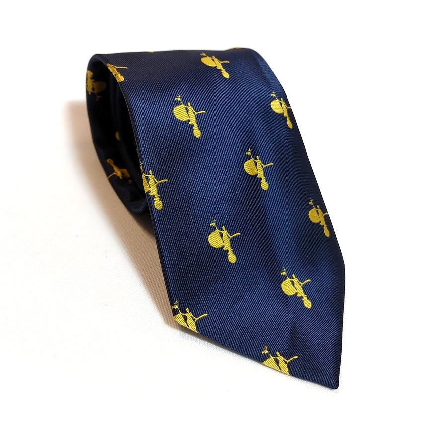 Corbata en azul marino con un elegante estampado repetido del Giraldillo en color dorado, inspirado en la figura que corona la Giralda. Un diseño distintivo y muy sevillano, ideal para aportar un toque cultural y sofisticado a cualquier conjunto formal.