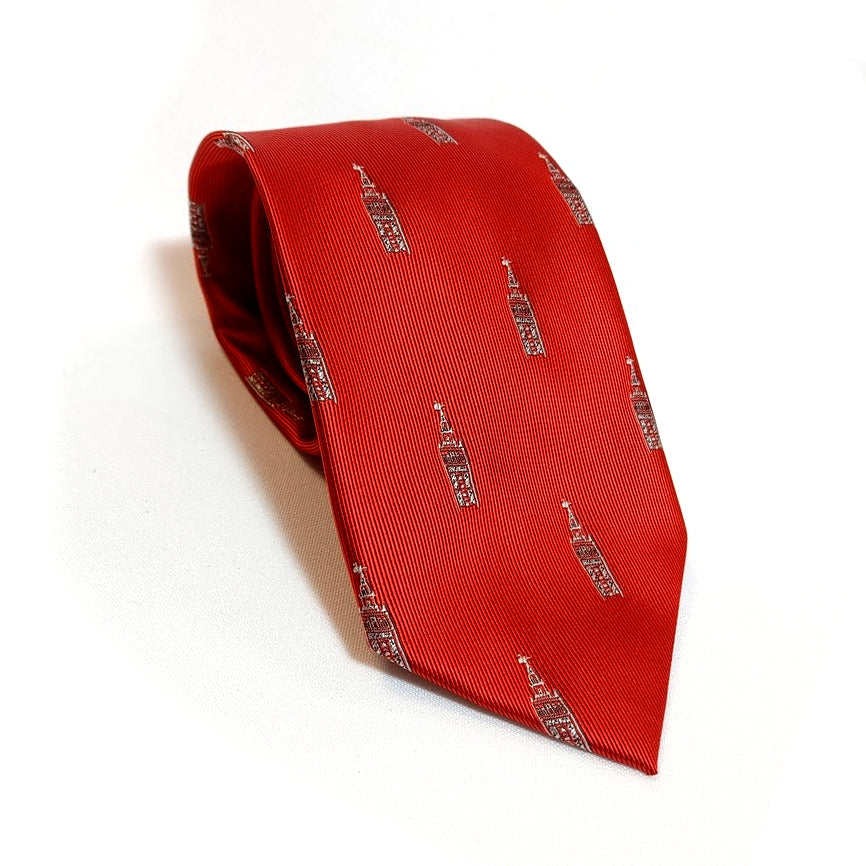 Corbata en color rojo con un elegante estampado repetido de la Giralda en tonos plateados. Un diseño distintivo y muy sevillano, perfecto para añadir un toque cultural y sofisticado a cualquier look formal.